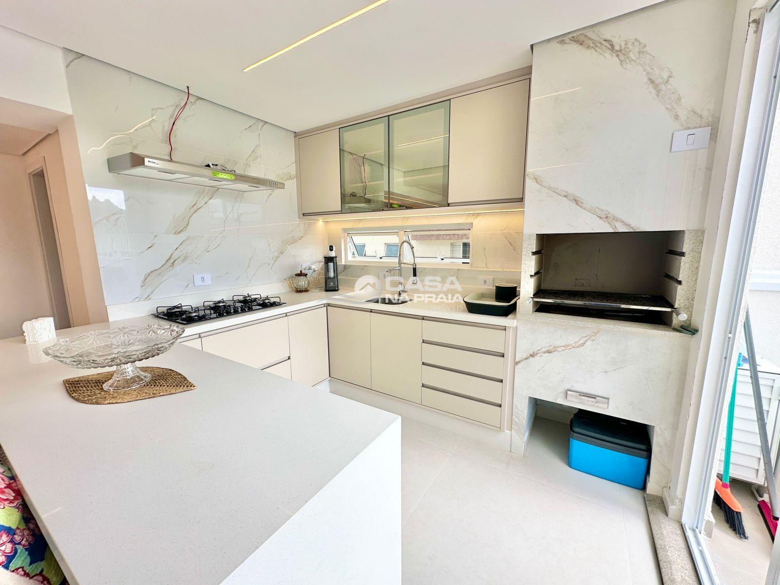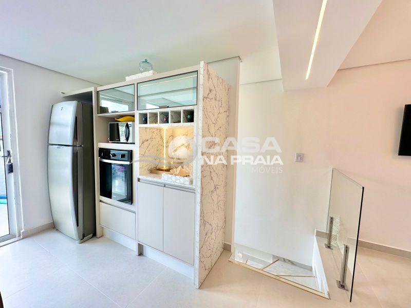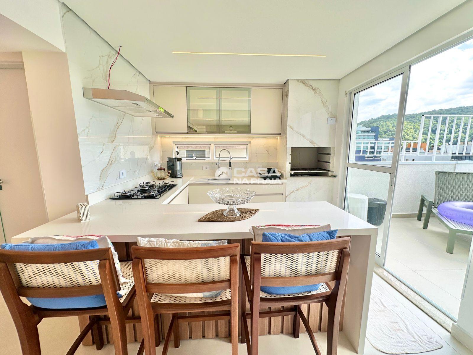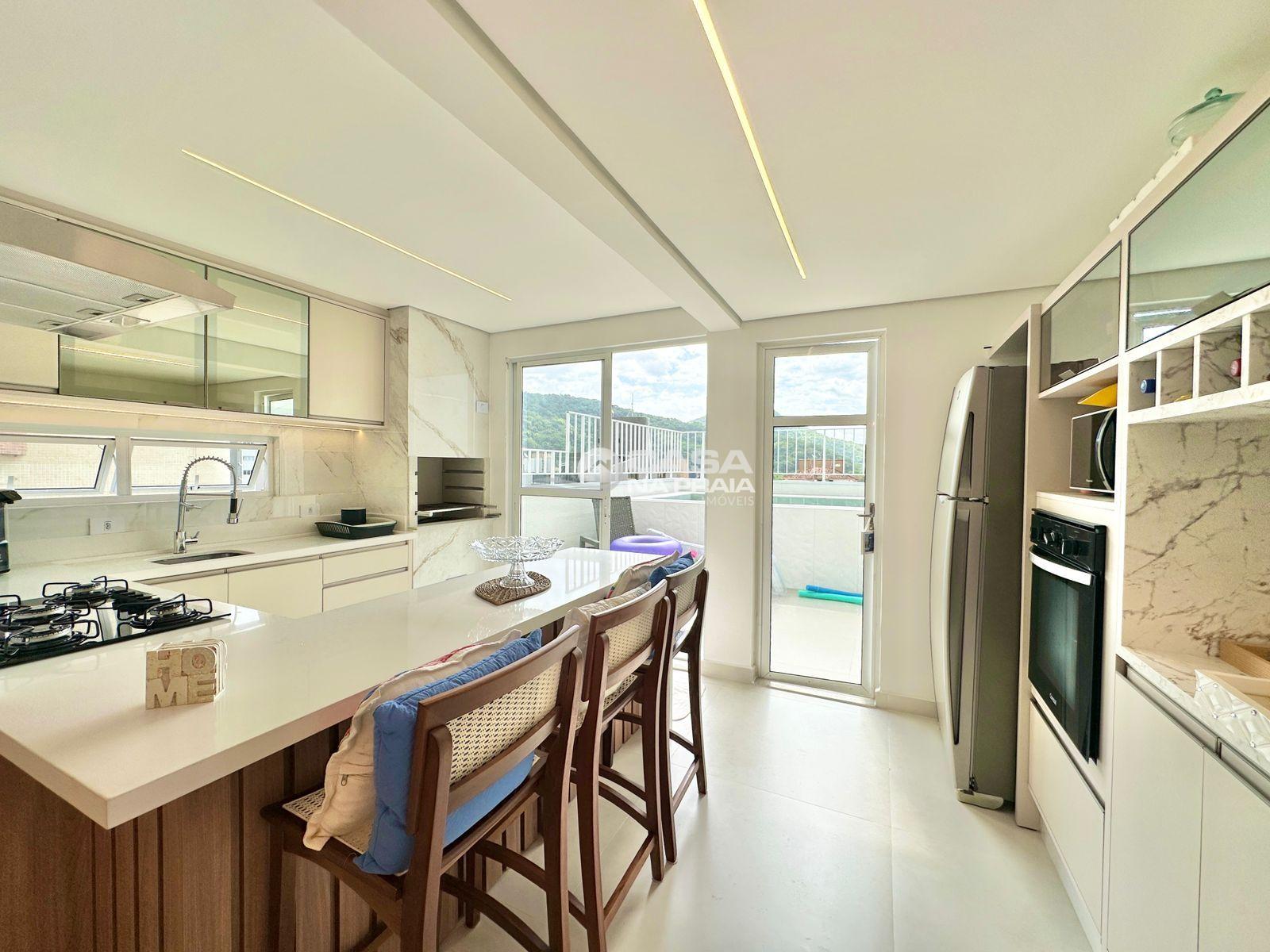 Sala de jantar integrada à cozinha com churrasqueira, banheiro, área de serviço e um amplo terraço, que dispõe de piscina privativa e ducha — perfeito para momentos de lazer e confraternização.