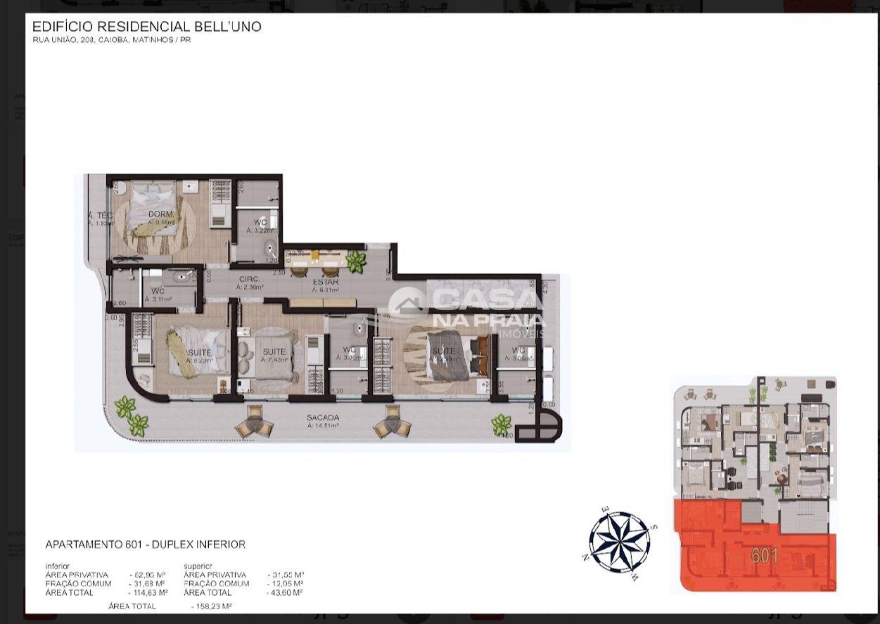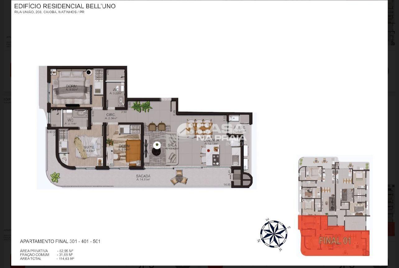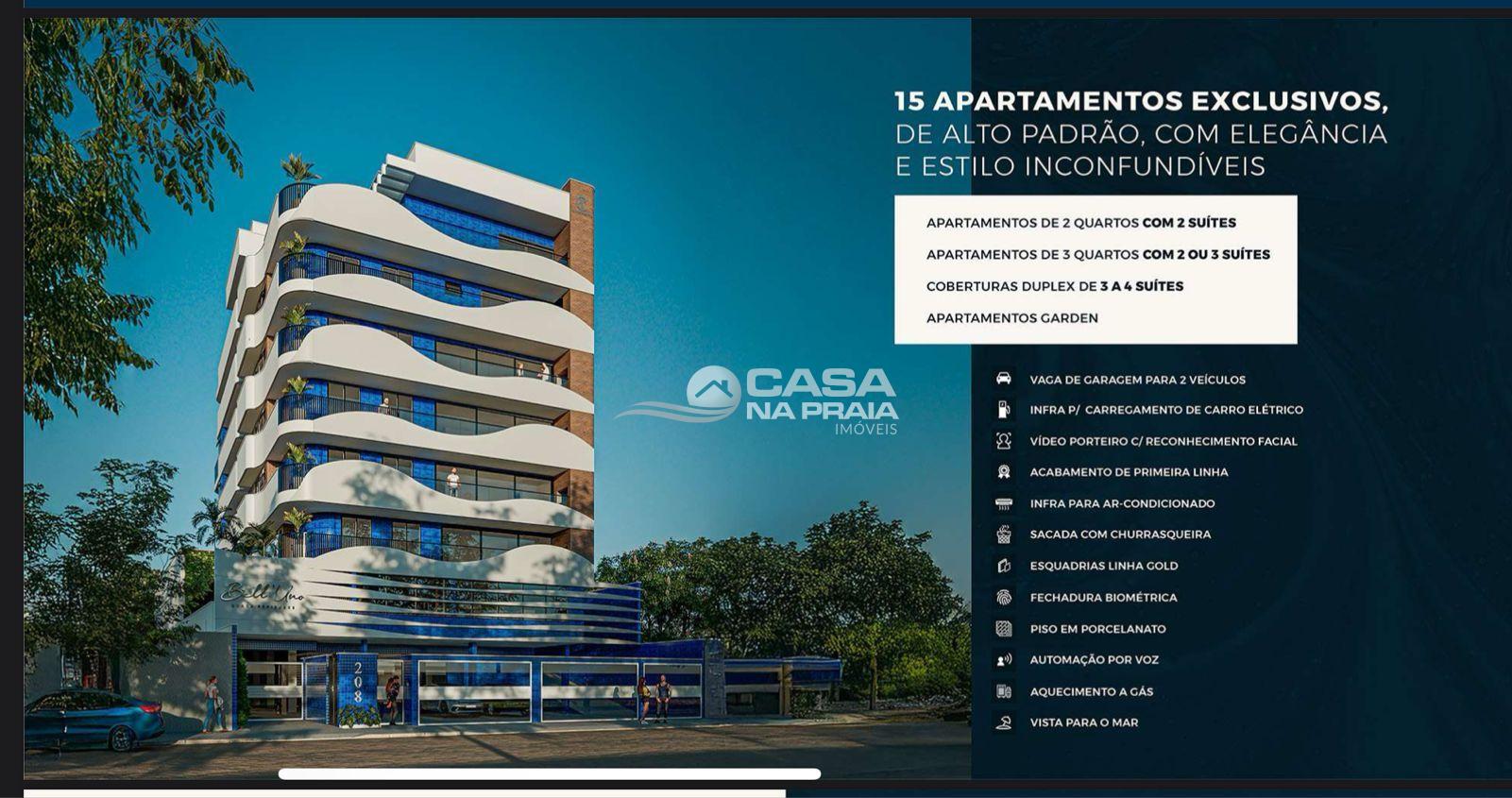 São 15 apartamentos, exclusivos de alto padrão, com plantas de 02 quartos (02 suítes), 03 quartos (01 e 02 Suítes) e coberturas com 03 ou 04 suítes. Os apartamentos estão equipados/possuem: Aquecimento gás, Fechadura biométrica, Vista mar, Automação por voz, Infra p/carregamento de carros elétricos, 02 vagas de garagem por apartamento, Vídeo porteiro c/ reconhecimento facial, Sacada com churrasqueira, Infra para ar condicionado e Esquadria linha Gold.