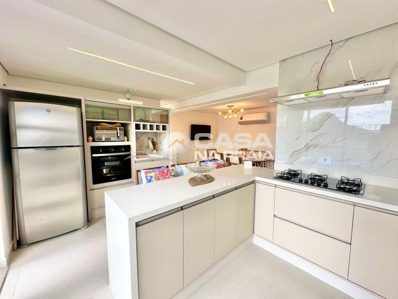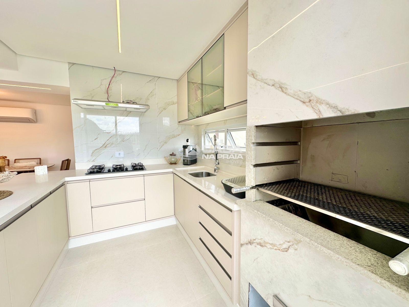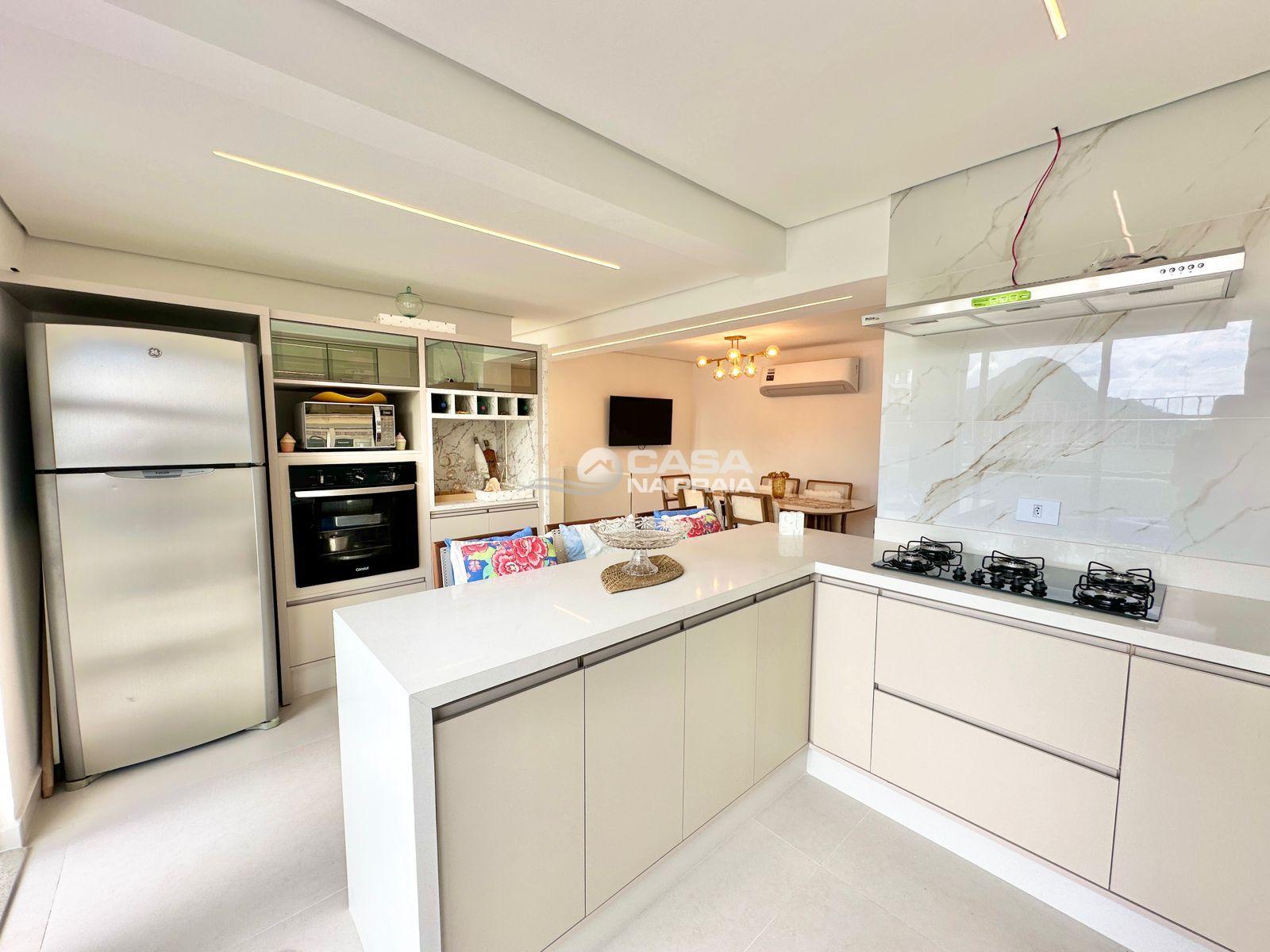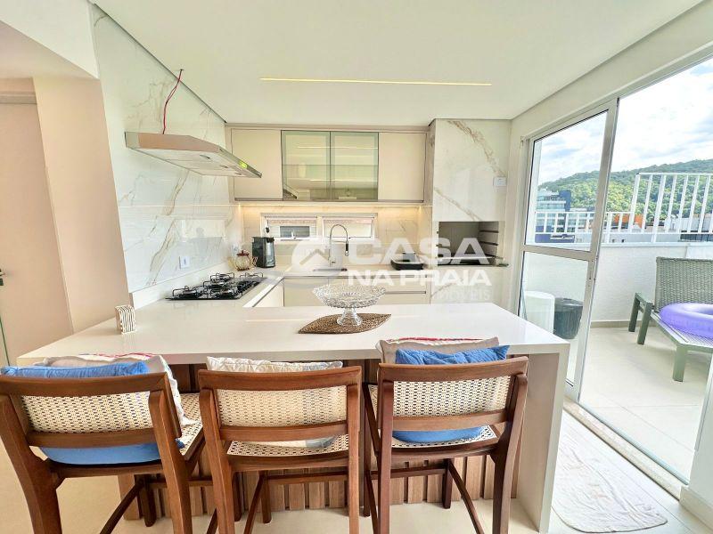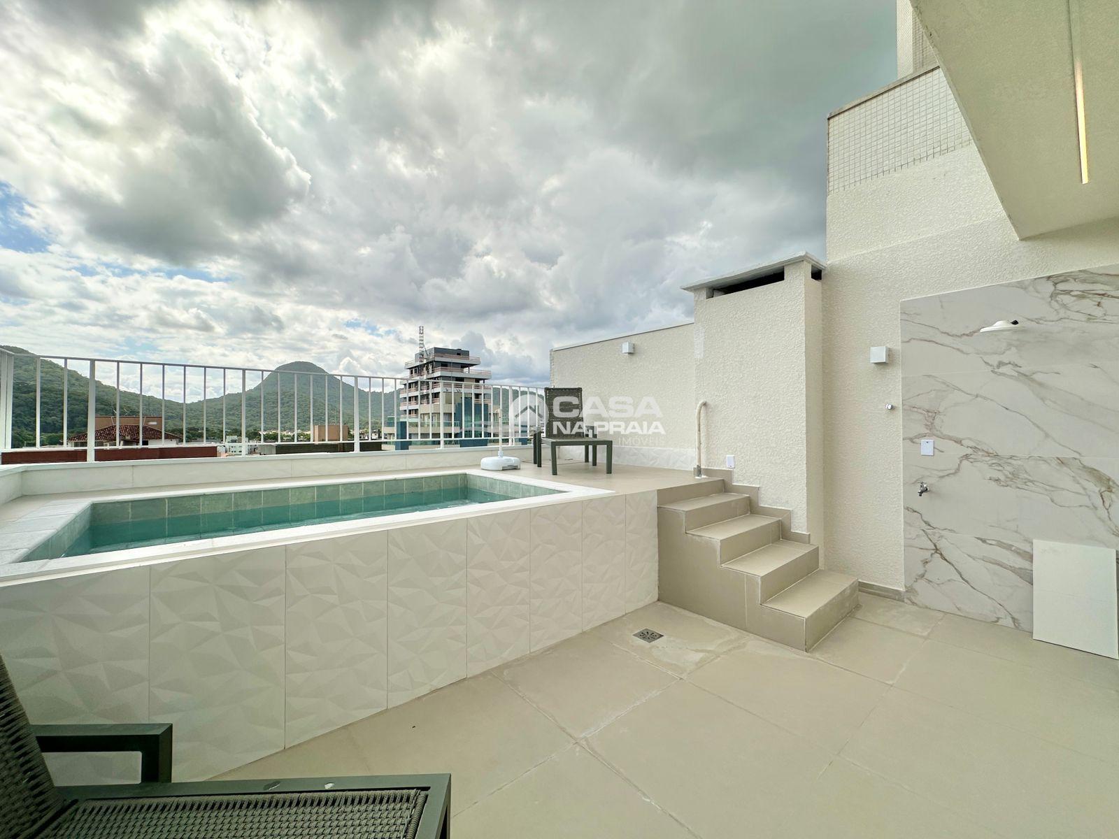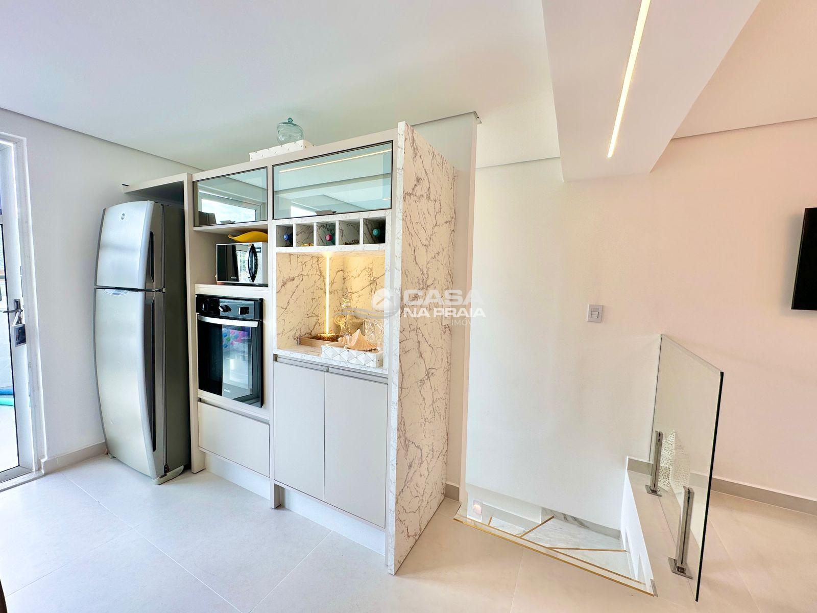 Sala de jantar integrada à cozinha com churrasqueira, banheiro, área de serviço e um amplo terraço, que dispõe de piscina privativa e ducha — perfeito para momentos de lazer e confraternização.
